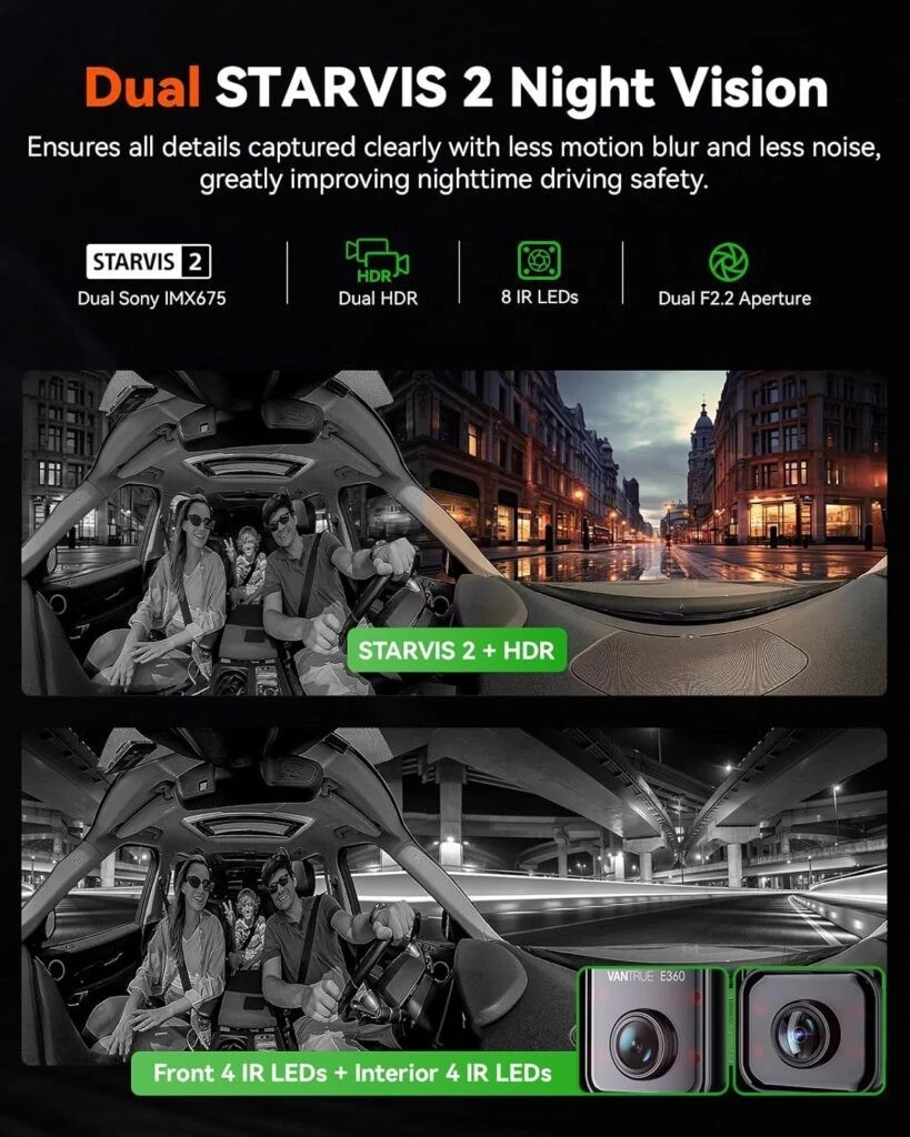Equipped with advanced STARVIS 2 sensors, dual front & interior cameras with infrared lights, and HDR processing, this starvis 2 dash cam delivers superior low-light performance and captures clear details like license plates—even in zero-light conditions.