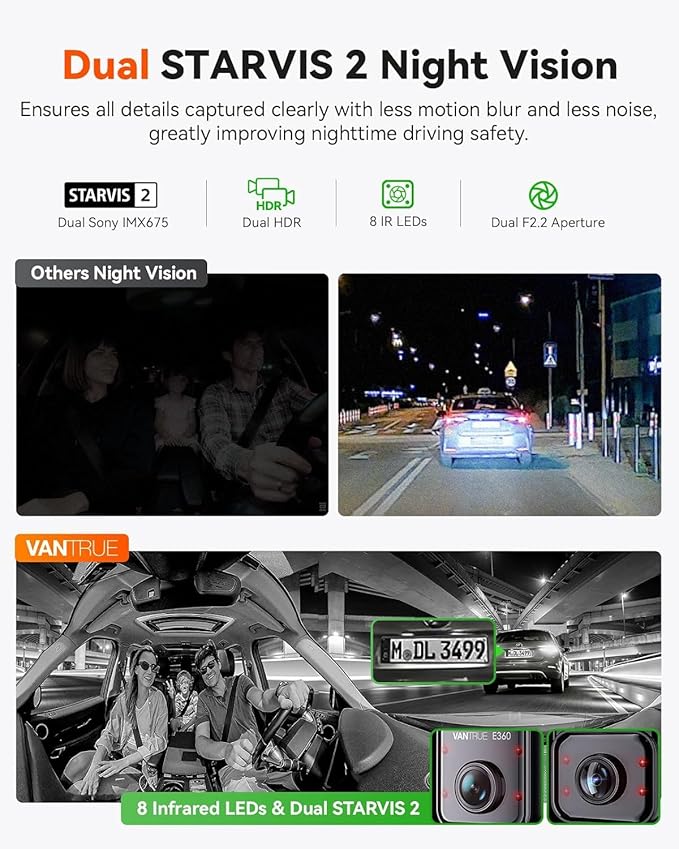 Equipped with advanced STARVIS 2 sensors, dual front & interior cameras with infrared lights, and HDR processing, this starvis 2 dash cam delivers superior low-light performance and captures clear details like license plates—even in zero-light conditions.