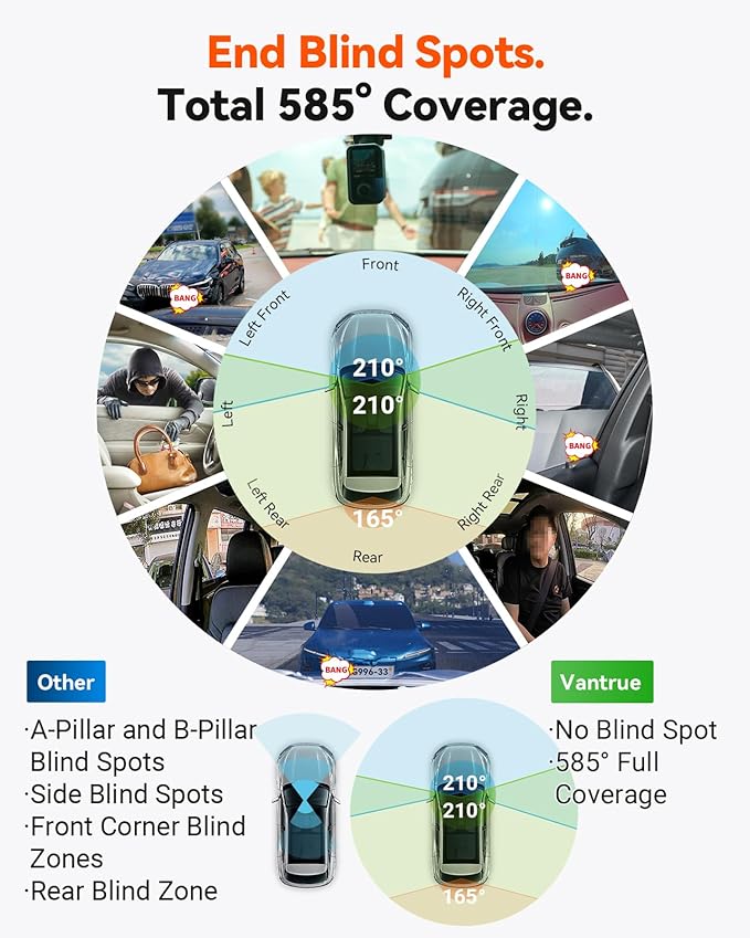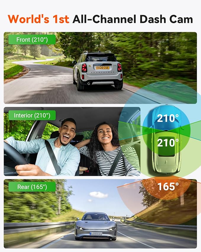 The Vantrue E360 Plus all-channel dash cam delivers industry-first full coverage with ultra-wide angles (Front 210° + Interior 210° + Rear 165°). Capture front, cabin, and rear simultaneously with 150% wider coverage than standard 4-channel dashcams for complete protection while driving or parked.