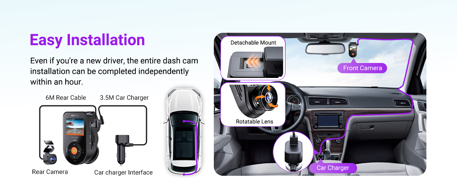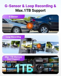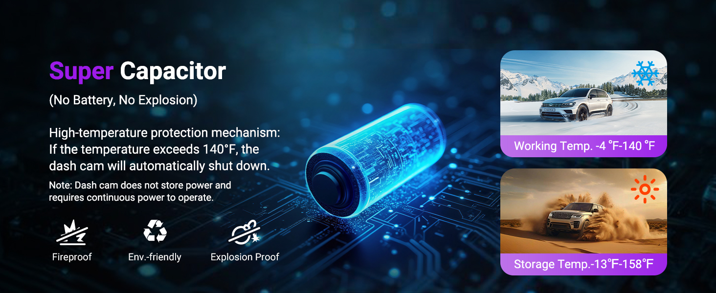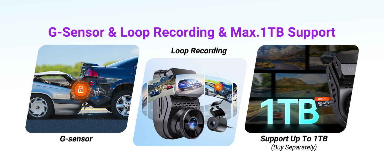 [Loop Recording, Supercapacitor, 1TB Support] Auto-overwrites old clips; rugged supercapacitor ensures explosion-proof safety; supports up to 1TB cards (≈86 hrs at 2160P/30FPS).