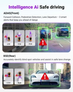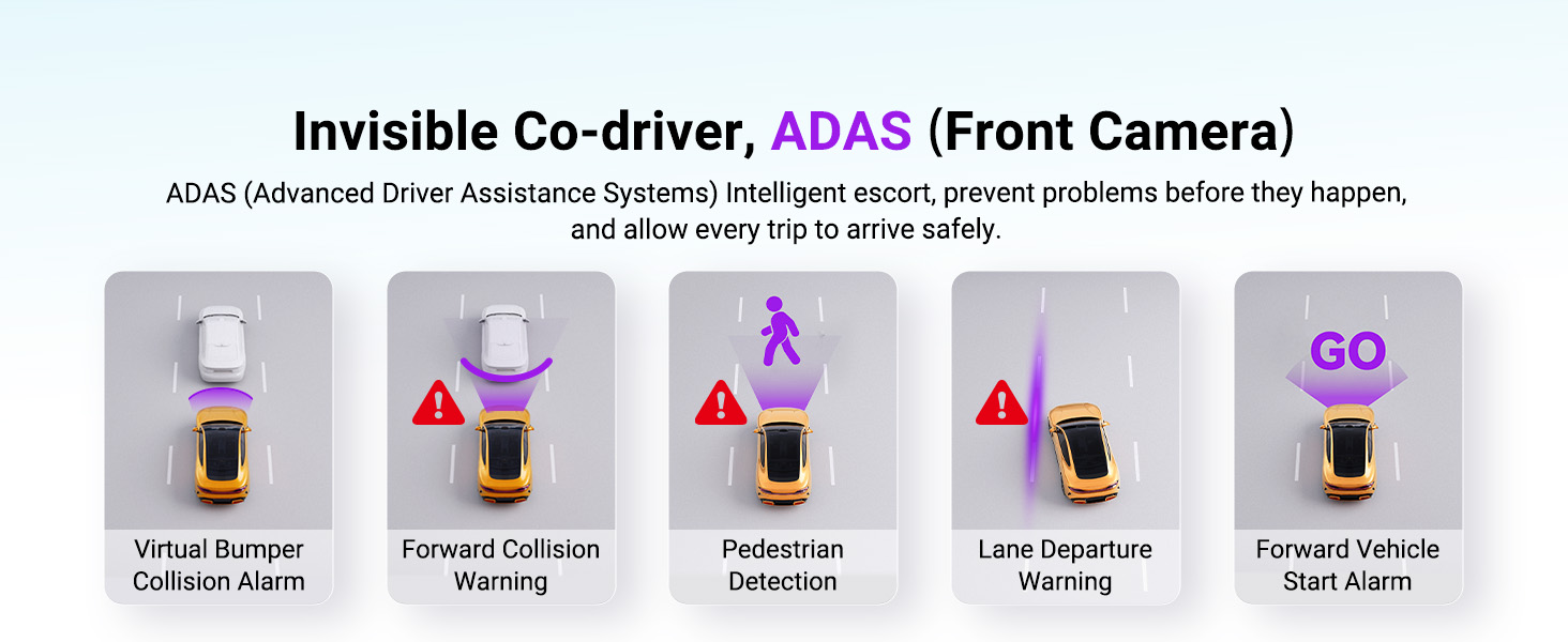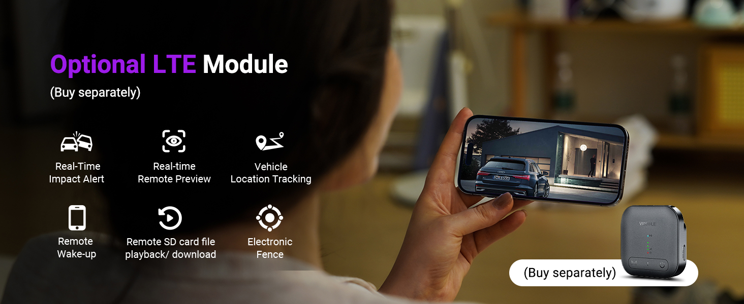 [ADAS & LTE Optional] ADAS warns of collisions, pedestrians, and lane drifts. Add LTE (sold separately) for 24/7 alerts, incident notifications, and remote live streaming.