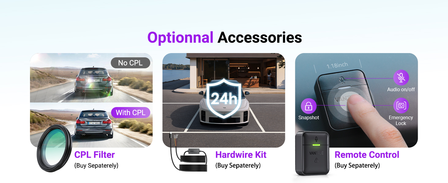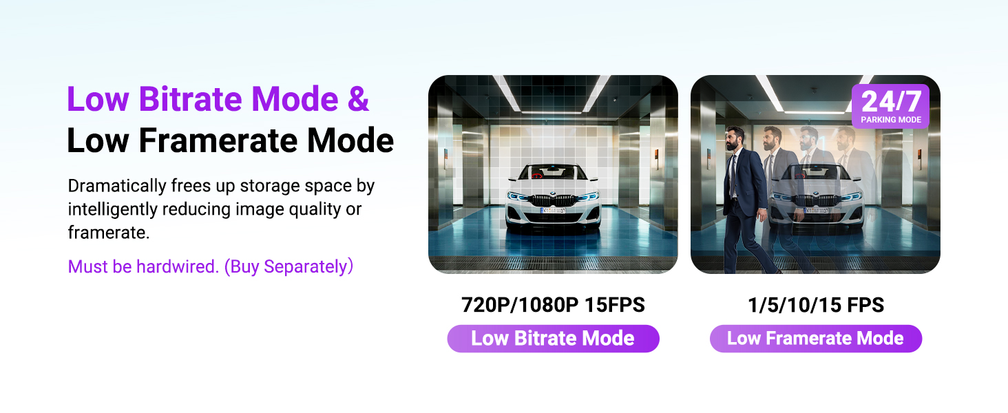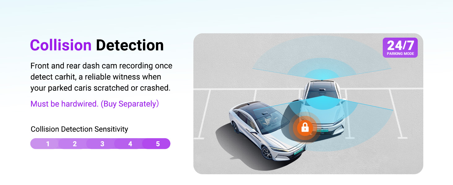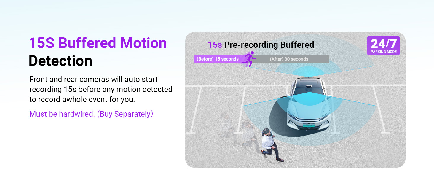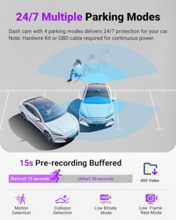[15s Buffered Event Recording] Parking mode saves 15s before impacts/scratches via motion detection, preserving vital proof (30% higher claim success). Features include Low-Light Vision (+30% brightness), collision detection, and frame optimization. Hardwire Kit required.