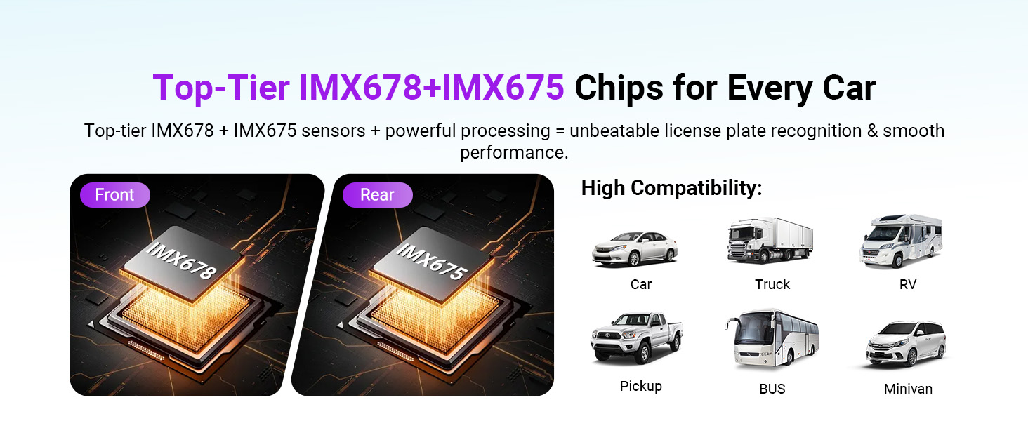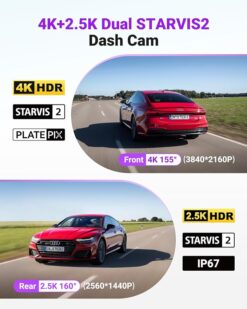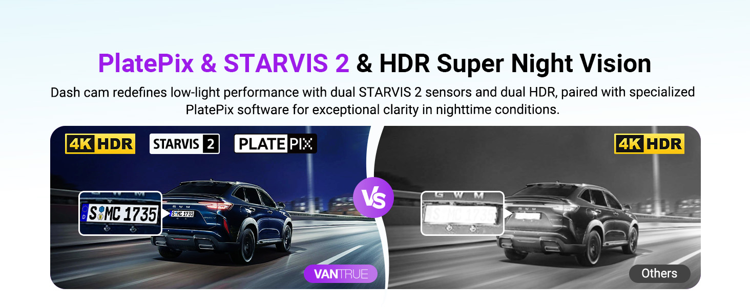 [Dual STARVIS 2 & HDR Night Vision] Dual STARVIS 2 sensors with PlatePix + HDR deliver clear 4K+2.5K footage in low light. STARVIS 2 boosts night detail, HDR balances exposure, and PlatePix sharpens plates—solving common night vision issues.