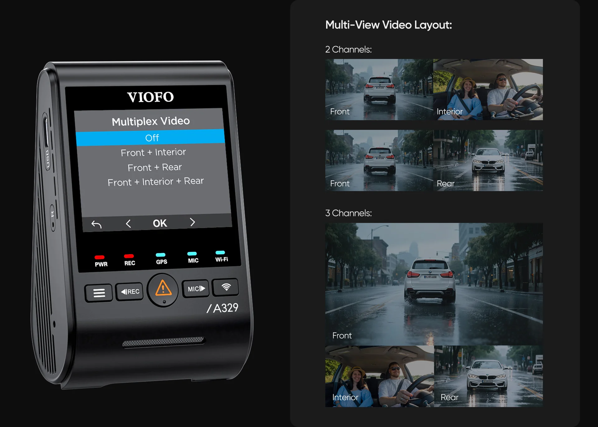 Viofo A329SW 3 Channel Dash Cam with Fisheye Cabin + Waterproof Rear Camera